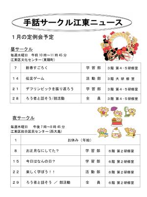 公開日:2026年01月05日手話サークル江東 1月のお知らせ新年、明けましておめでとうございます。今年もよろしくお願いいたします。昼サークルは1月7日、夜サーク...