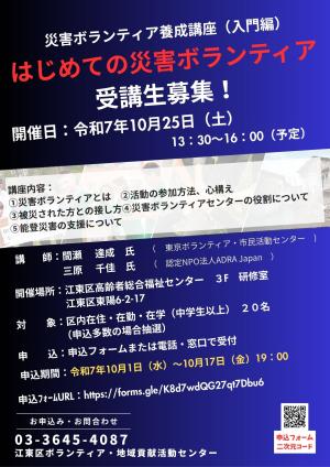 イベント情報公開日:2025年10月02日災害ボランティア養成講座(入門編)「はじめての災害ボランティア」受講生募集