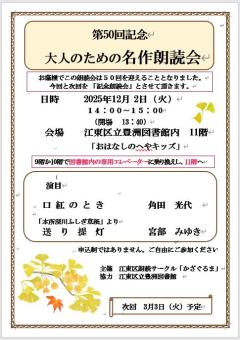 公開日:2025年11月03日こども朗読サークルかざぐるま大人のための名作朗読会開催日:2025年12月02日(火)