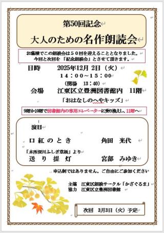 2012年3月より 江東区立豊洲図書館にて、年4回(3月、6月、9月、12月第1火曜日)